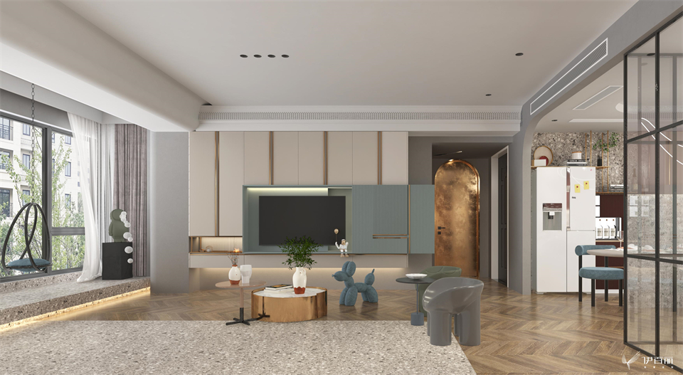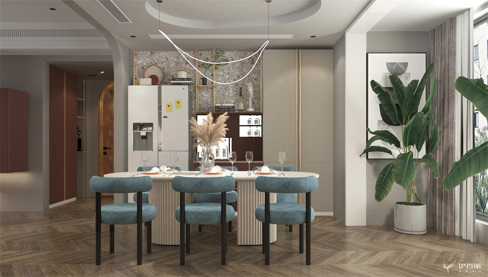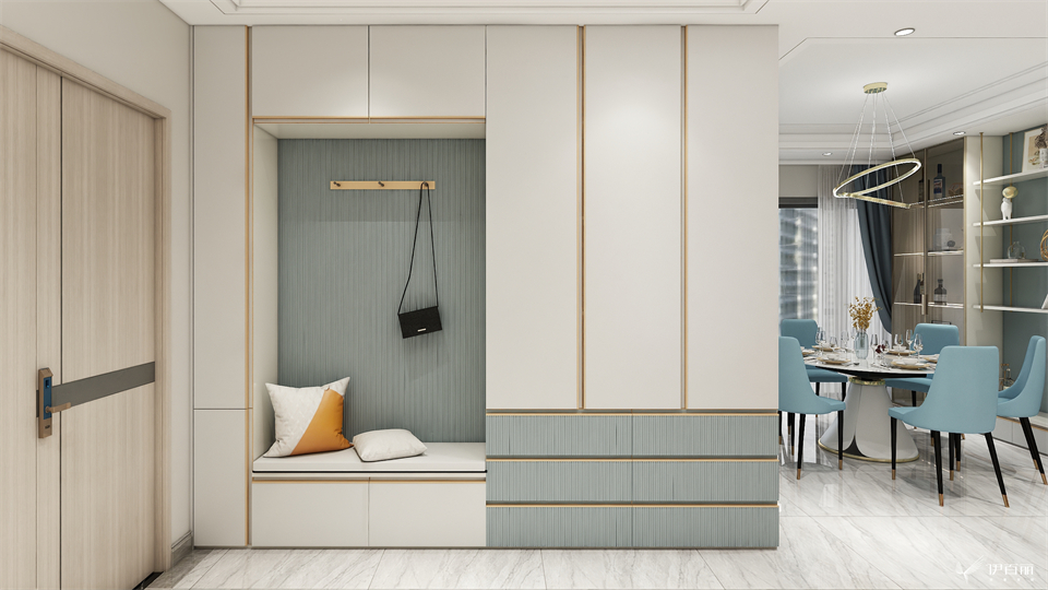 以柔和细腻的纯色系柜体加上格调蓝的点缀,赋予空间张力与活力。顺着柔和的光线跳动,在功能与美的平衡下,将舒适宜人的环境表达得恰到好处,体现暗自华贵的气质。