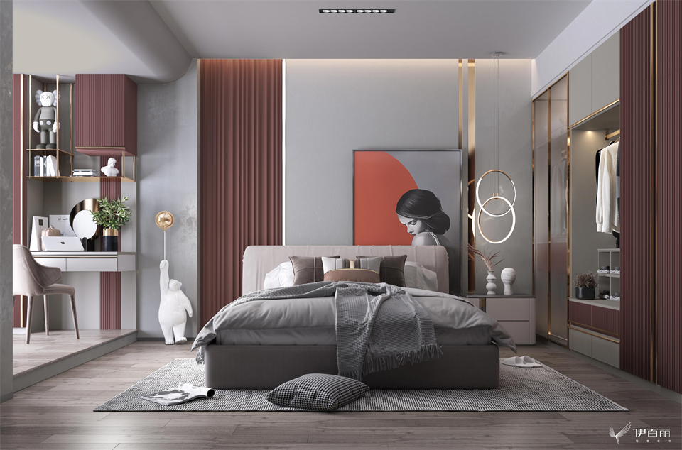 主卧空间以浅色的象牙白作为基点,融合了带有沙漠薄雾感的格调橘莫兰迪色,独具亲切感,温暖不失品质,高贵、游戏、柔美、新潮在此完美结合!