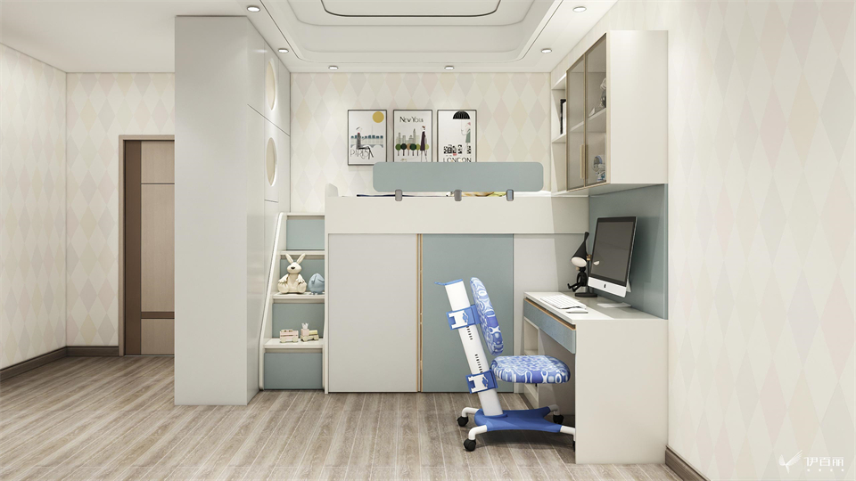 青少年房以白色调起笔,蓝色点缀,或深或浅,静谧自然的氛围如一股清泉般缓缓地流淌其中。书桌+床体的组合方式,不仅可以节约空间,也为孩子打造了专属的学习区域,一举两得。