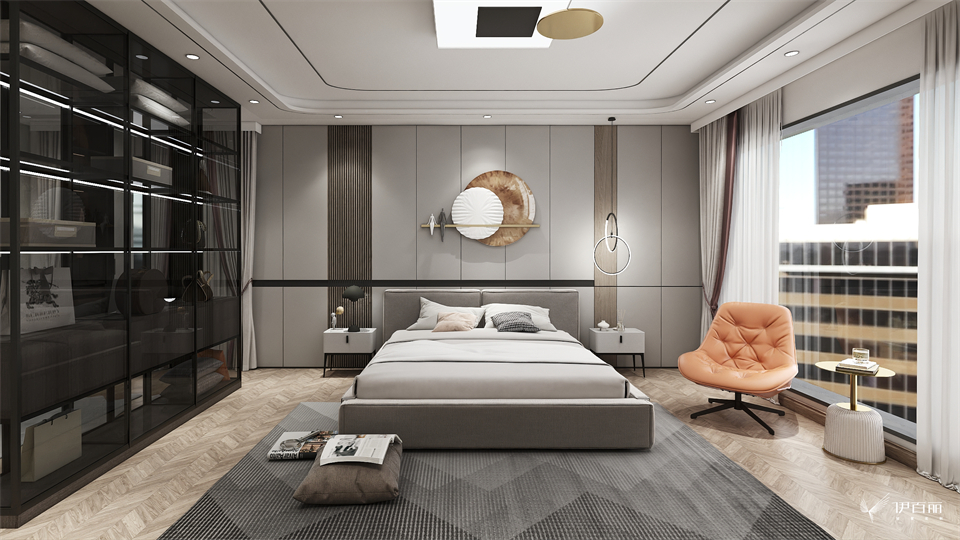 主卧维持与外部空间同样的格调,保持了一贯的游戏极简设计。木色与玻璃隔断柜的结合,隔而不断,巧妙划分卧室空间,让空间更有层次感,打造悠闲安适的场域特性。