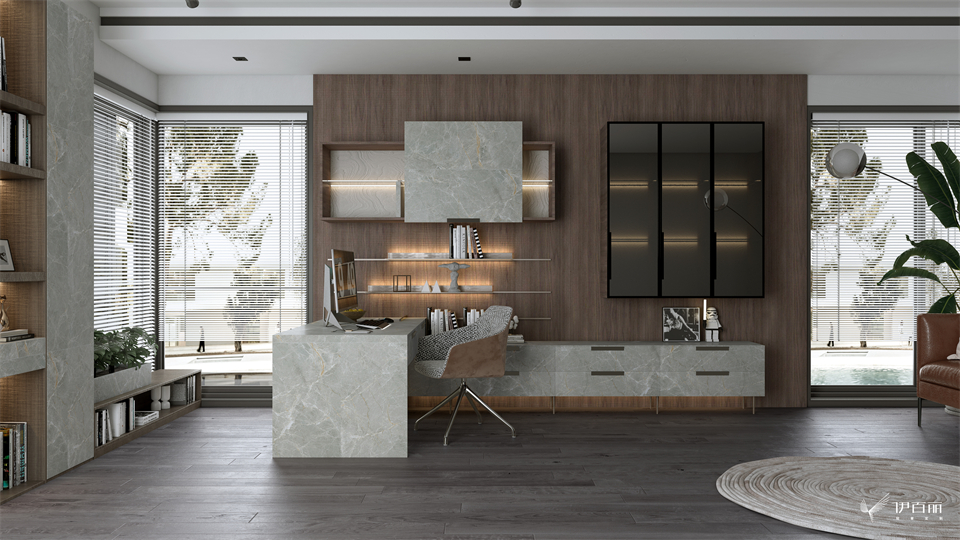 光洁如玉的书桌搭接同色吊柜,奢而不华,平衡了实用的需求和美感的享受。封闭与开放相结合的吊柜设计,极简窄框玻璃门配合意式极简韵味浓郁的内嵌拉手,将优雅与舒适凝聚于空间,营造纯粹且高级的空间气质。