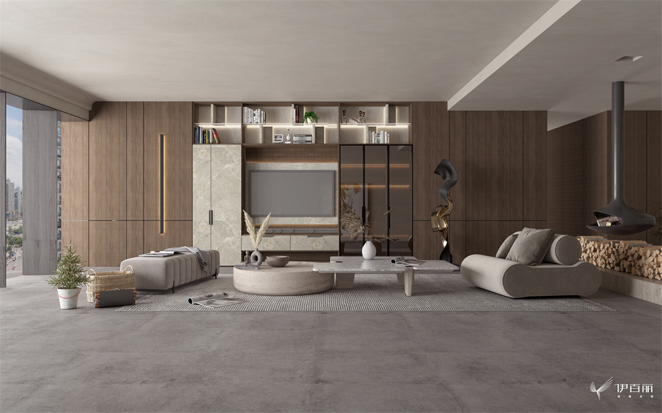 客厅空间以大面积的凤凰木柜体加上利落写意的银龙玉门板,比例呼应,色彩跳跃,为空间注入十足的艺术气息。极简窄框玻璃门与木制层板灯的相互对话,调和出有温度与情感的精致空间图景。