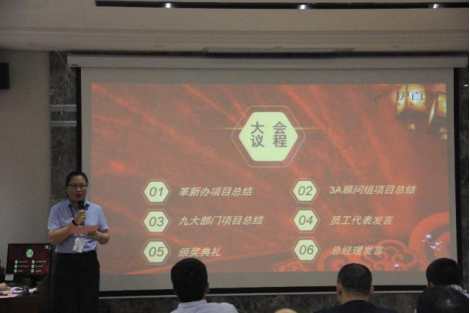 大会的议程,分为6个环节:革新办项目总结;九大部门项目总结;员工代表发言;3A顾问组项目总结;颁奖典礼;领导总结发言。